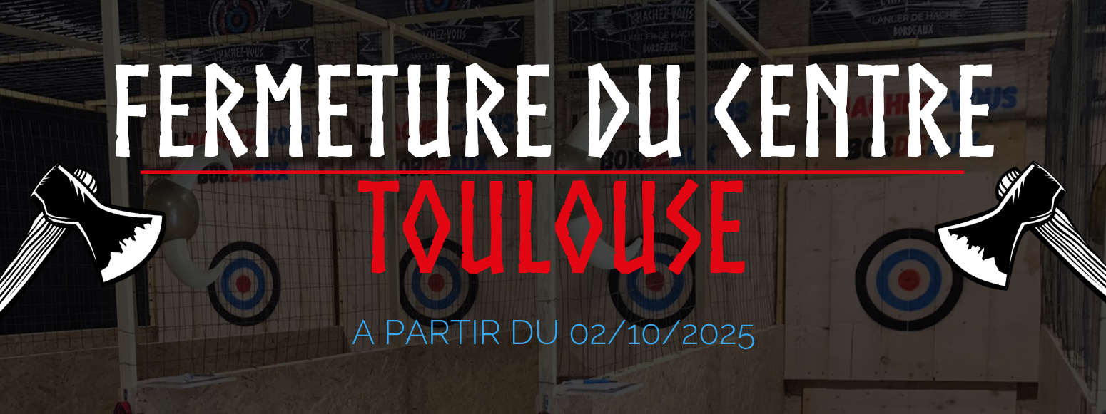 L'HACHEZ-VOUS LancerDeHacheToulouse est le premier centre à Toulouse, où vous avez le droit de lancer des haches, et le réseau L'HACHEZ-VOUS est le N°1 FRANÇAIS DU LANCER DE HACHE, avec 7 centres en France !!! Grâce à nos conseils, étonnez vos amis et soyez le plus fort !